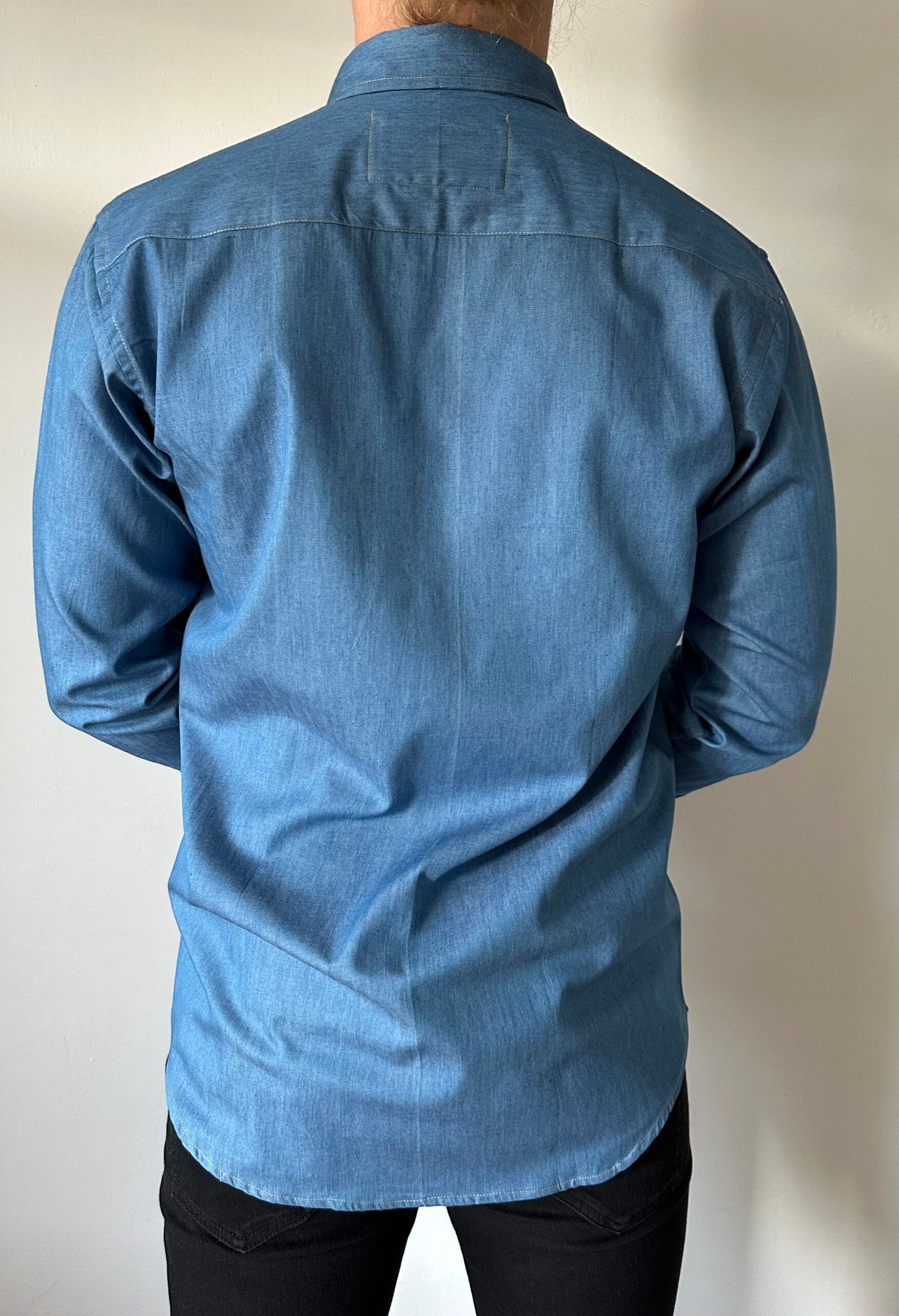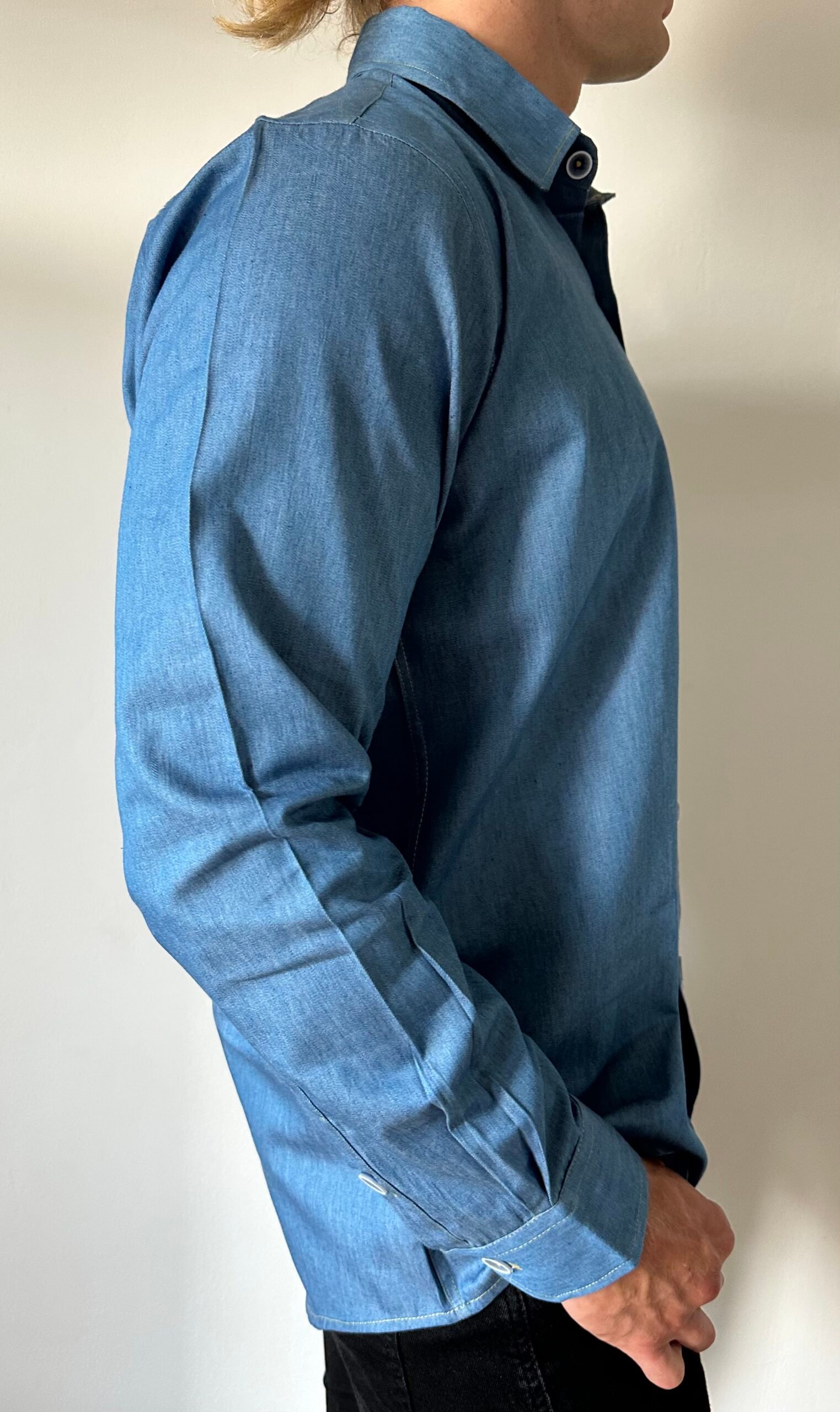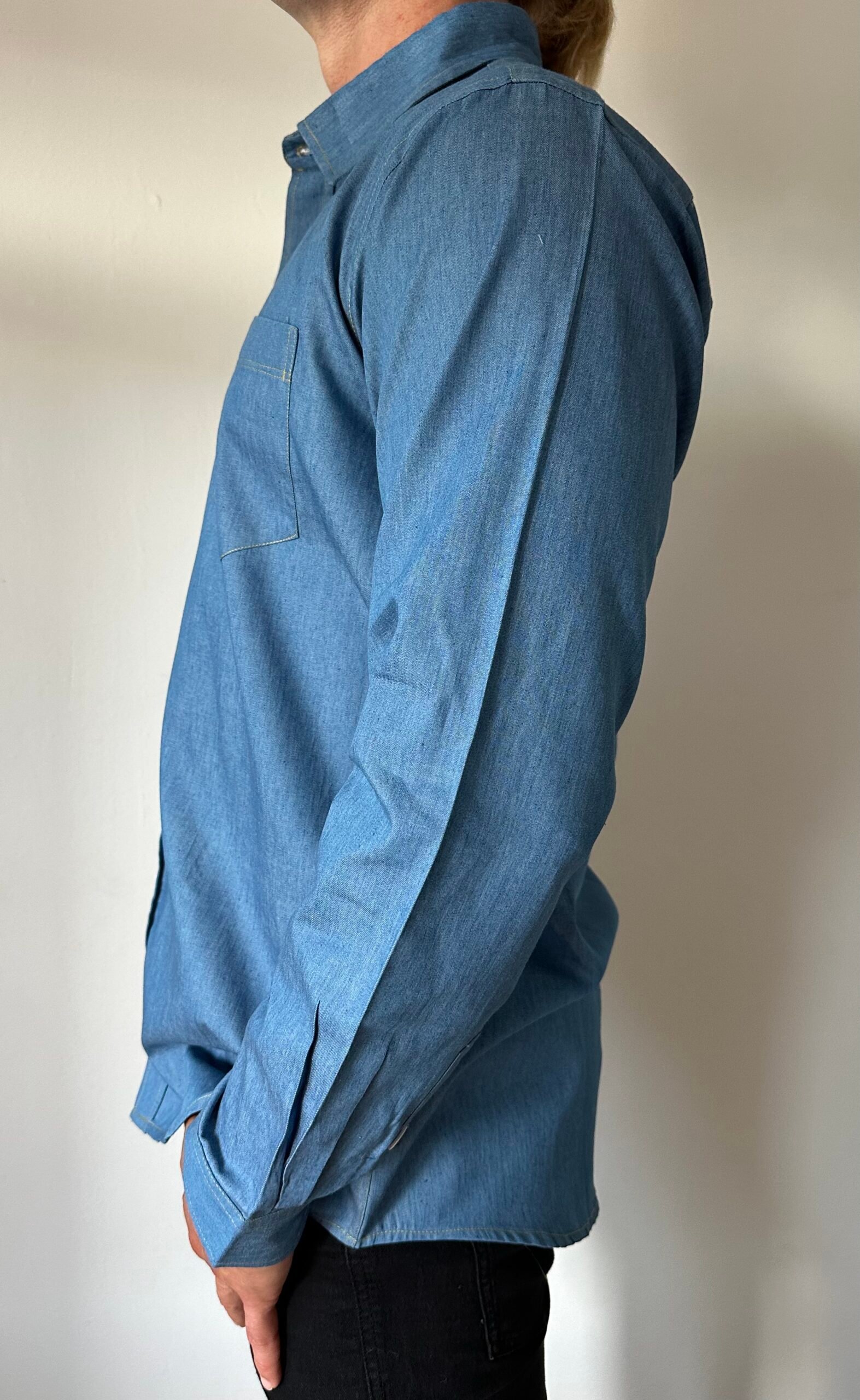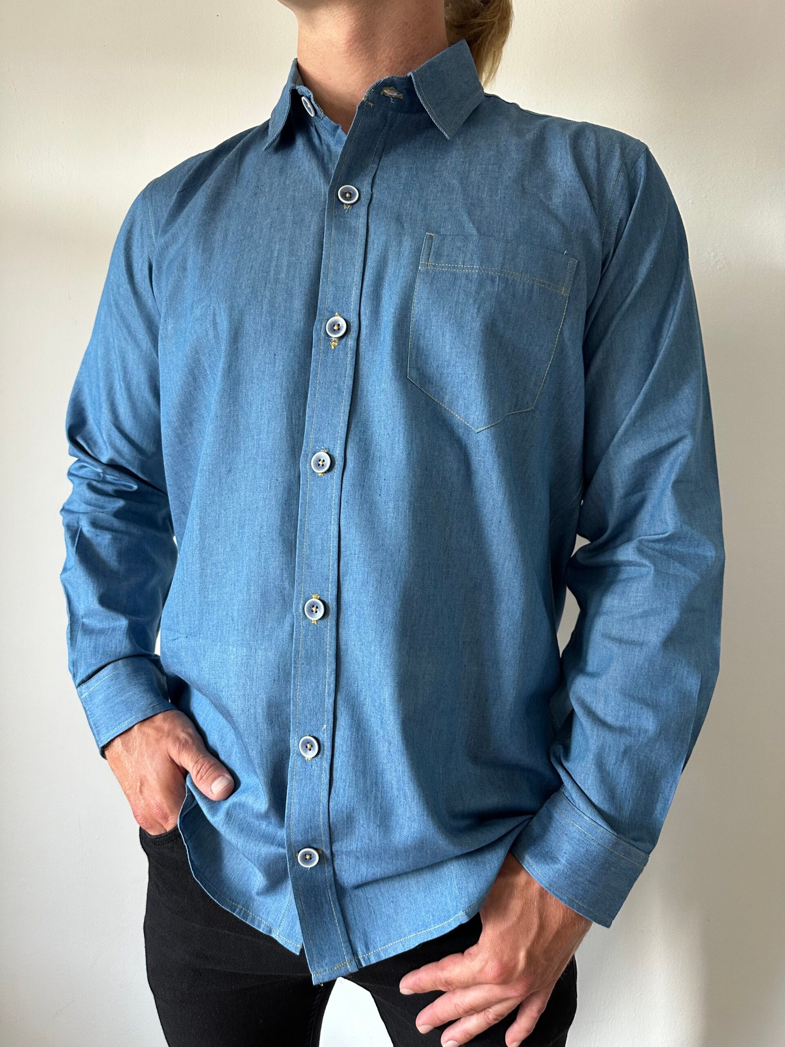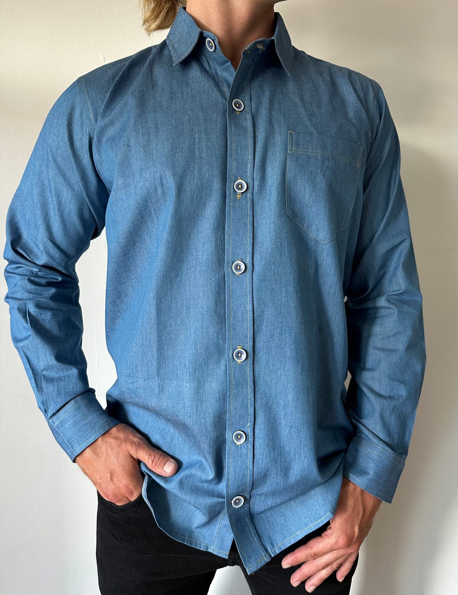 A very pretty denim shirt ,white and blue buttons and a handy breast pocket